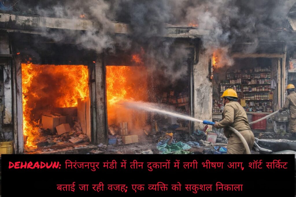देहरादून। के निरंजनपुर मंडी क्षेत्र में गुरुवार को अचानक आग लगने से अफरा-तफरी मच गई। जानकारी के अनुसार Niranjanpur Mandi में स्थित तीन दुकानों में भीषण आग लग गई। आग लगने की सूचना मिलते ही आसपास के दुकानदारों और स्थानीय लोगों में हड़कंप मच गया।
