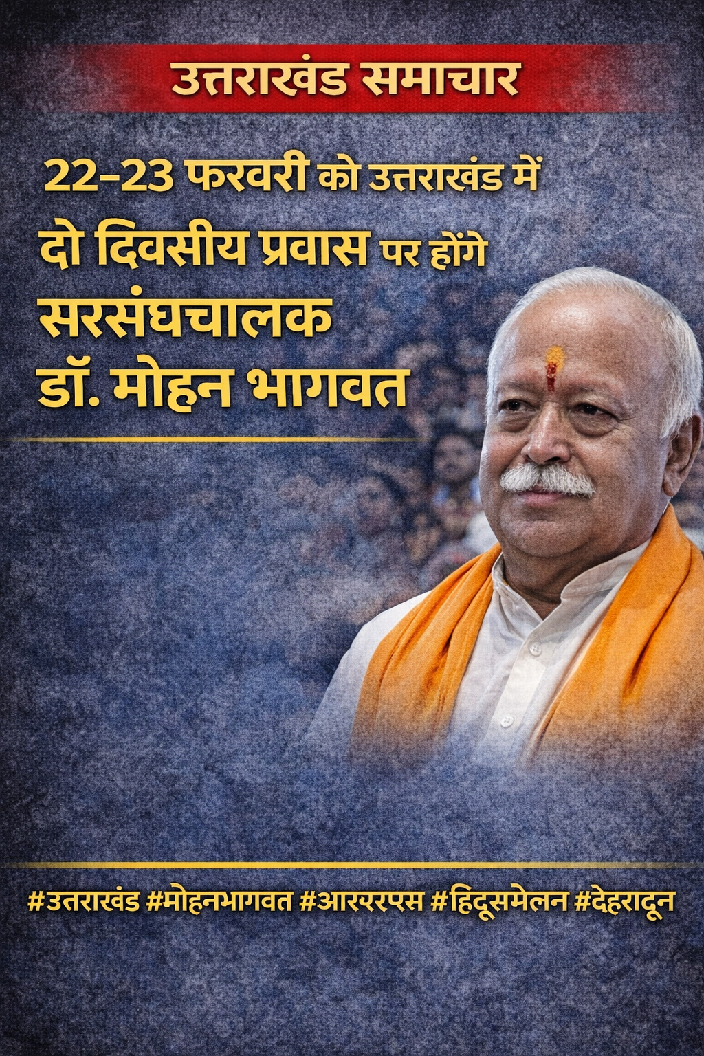 देहरादून – राष्ट्रीय स्वयंसेवक संघ (आरएसएस) के सरसंघचालक डॉ. मोहन भागवत आगामी 22 और 23 फरवरी 2026 को दो दिवसीय उत्तराखंड प्रवास पर देहरादून में रहेंगे। उनके आगमन से पहले ही प्रदेशभर में 1000 हिंदू सम्मेलन आयोजित किए जाने का लक्ष्य रखा गया है।