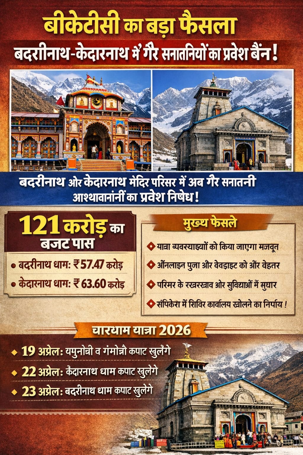 देहरादून। उत्तराखंड की धार्मिक आस्था के प्रमुख केंद्र बदरीनाथ और केदारनाथ धाम को लेकर बदरीनाथ-केदारनाथ मंदिर समिति (बीकेटीसी) ने एक बड़ा निर्णय लिया है। समिति की बजट बैठक में धामों की व्यवस्था, यात्रा प्रबंधन और विकास से जुड़े कई महत्वपूर्ण प्रस्तावों को मंजूरी दी गई। सबसे अहम फैसला यह रहा कि अब बदरीनाथ और केदारनाथ मंदिर परिसर में गैर-सनातनियों के प्रवेश पर रोक लगाने का प्रस्ताव पारित किया गया।