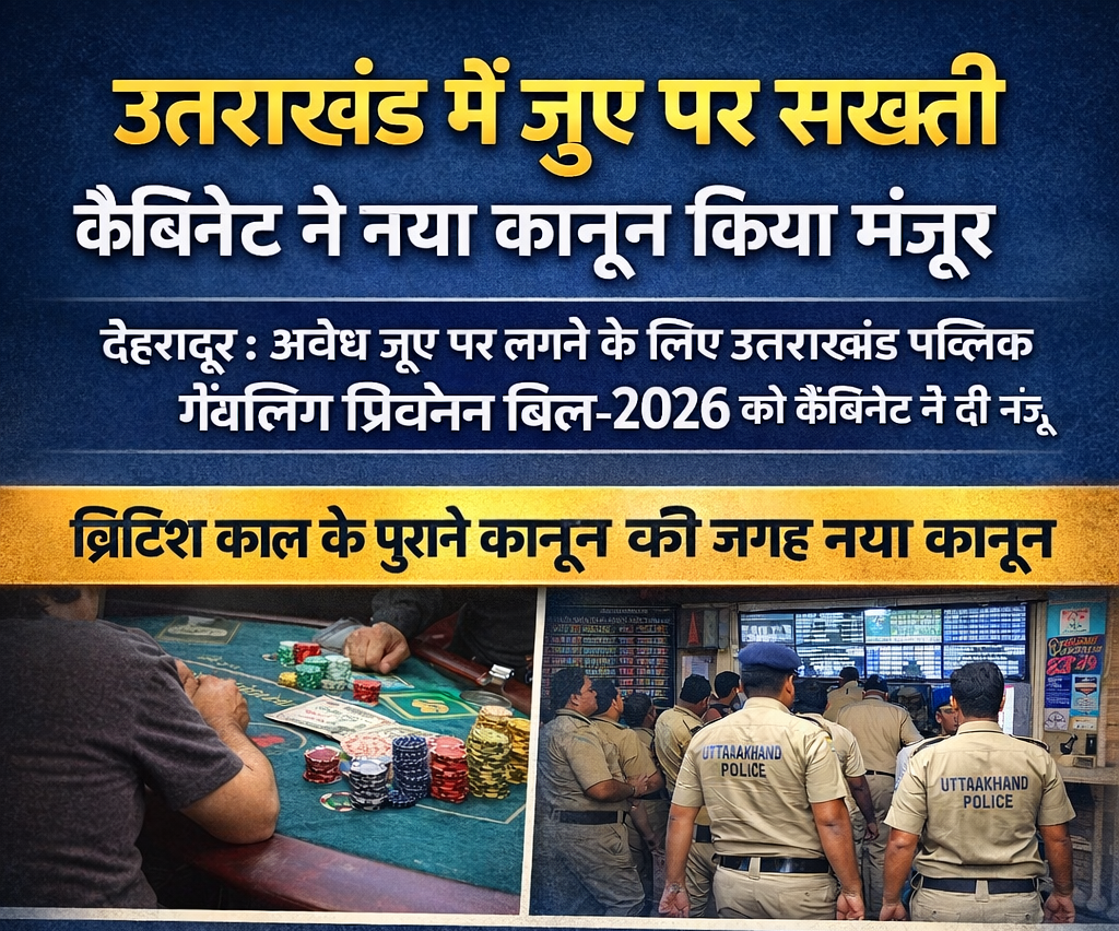 देहरादून: उत्तराखंड सरकार ने राज्य में अवैध जुए पर रोक लगाने के लिए बड़ा कदम उठाया है। राज्य कैबिनेट ने “उत्तराखंड पब्लिक गैम्बलिंग प्रिवेंशन बिल-2026”को मंजूरी दे दी है। इस नए कानून के लागू होने के बाद प्रदेश में जुए से जुड़े अपराधों पर सख्त कार्रवाई की जाएगी।