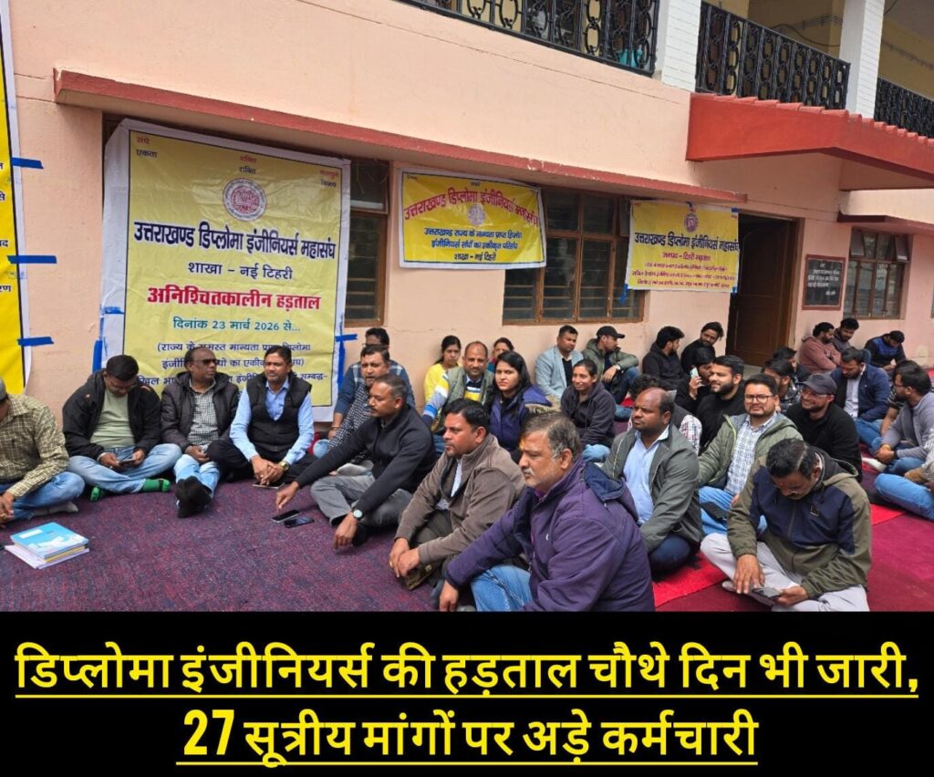 नई टिहरी। उत्तराखंड डिप्लोमा इंजीनियर महासंघ द्वारा अपनी 27 सूत्रीय मांगों को लेकर शुरू की गई हड़ताल चौथे दिन भी जारी रही। महासंघ से जुड़े इंजीनियर लोक निर्माण विभाग के निरीक्षण भवन परिसर में धरने पर बैठे रहे और सरकार के खिलाफ नाराजगी जताई।