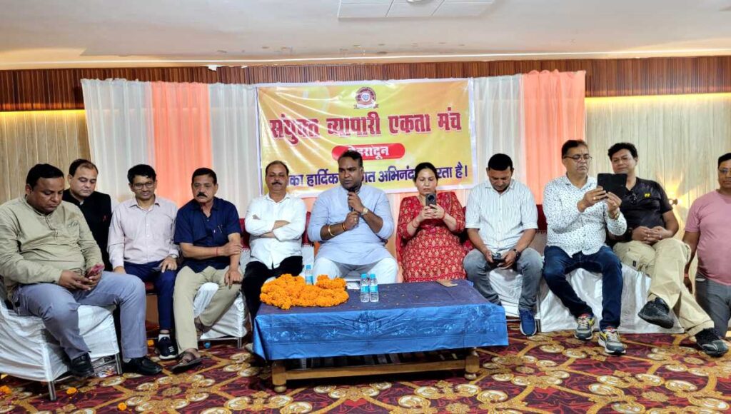 महानगर अध्यक्ष सिद्धार्थ उमेश अग्रवाल ने संयुक्त व्यापारी एकता मंच के माध्यम से सभी व्यापारियों से वार्तालाप करते हुए कहा कि आप लोगों की जो टैक्स को लेकर जो भी विषय हैं वह सभी विषय विचारणीय है मुझे लगता है कि भारतीय जनता पार्टी की सरकार पुष्कर सिंह धामी जी के नेतृत्व में उत्तराखंड के सभी व्यापारियों के सहयोगी सरकार है हमारी सरकार के द्वारा लगातार समय-समय पर व्यापारियों को सहयोग देने का काम किया है आने वाले समय में भी हम सब व्यापारियों के साथ कंधे से कंधे मिलाकर खड़े हैं यह जो टैक्स का विषय है इस टैक्स के विषय को लेकर देहरादून नगर निगम के महापौर एवं माननीय मुख्यमंत्री पुष्कर सिंह धामी जी के साथ बैठकर विचार कर सकारात्मक निर्णय लिया जाएगा जो व्यापारियों के हित का होगा मैं आप सभी को आश्वासन देना चाहूंगा कि माननीय मुख्यमंत्री जी प्रत्येक व्यापारी के विषय को लेकर चिंतित रहते हैं चाहे वह छोटे से छोटा व्यापारी हो या बड़े से बड़ा व्यापारी मैं आशा करता हूं कि आप सब लोग माननीय मुख्यमंत्री जी के अग्रिम आदेश तक भारतीय जनता पार्टी की सरकार के साथ मिलकर सही निर्णय लेने में सहायक सिद्ध होंगे।